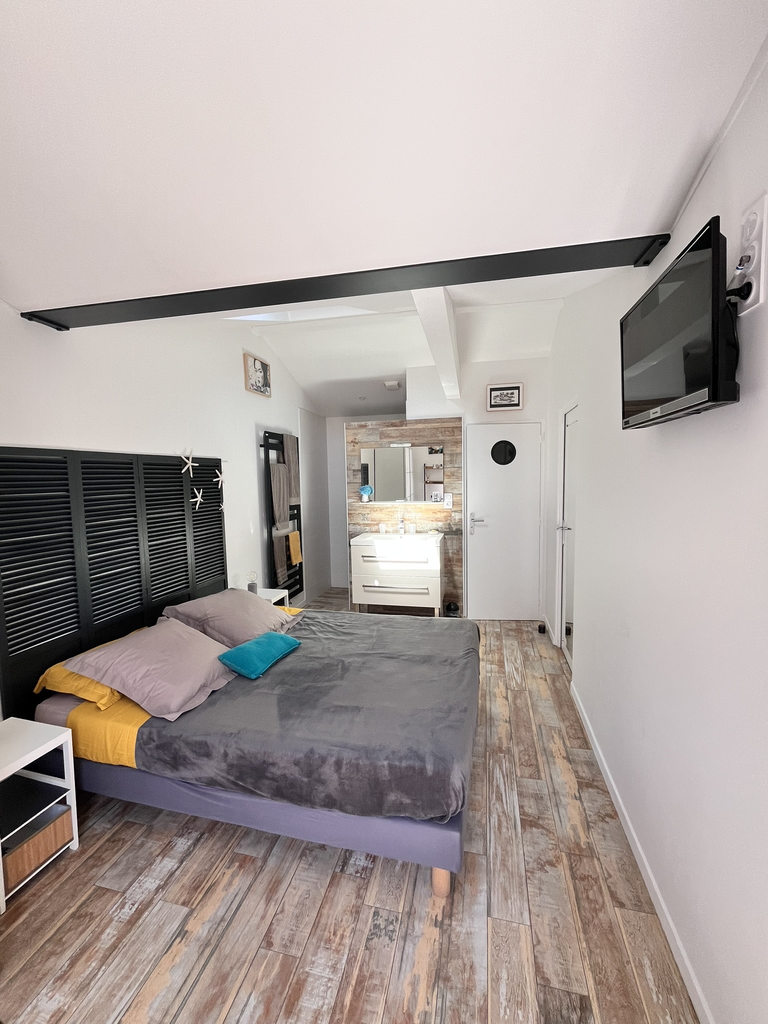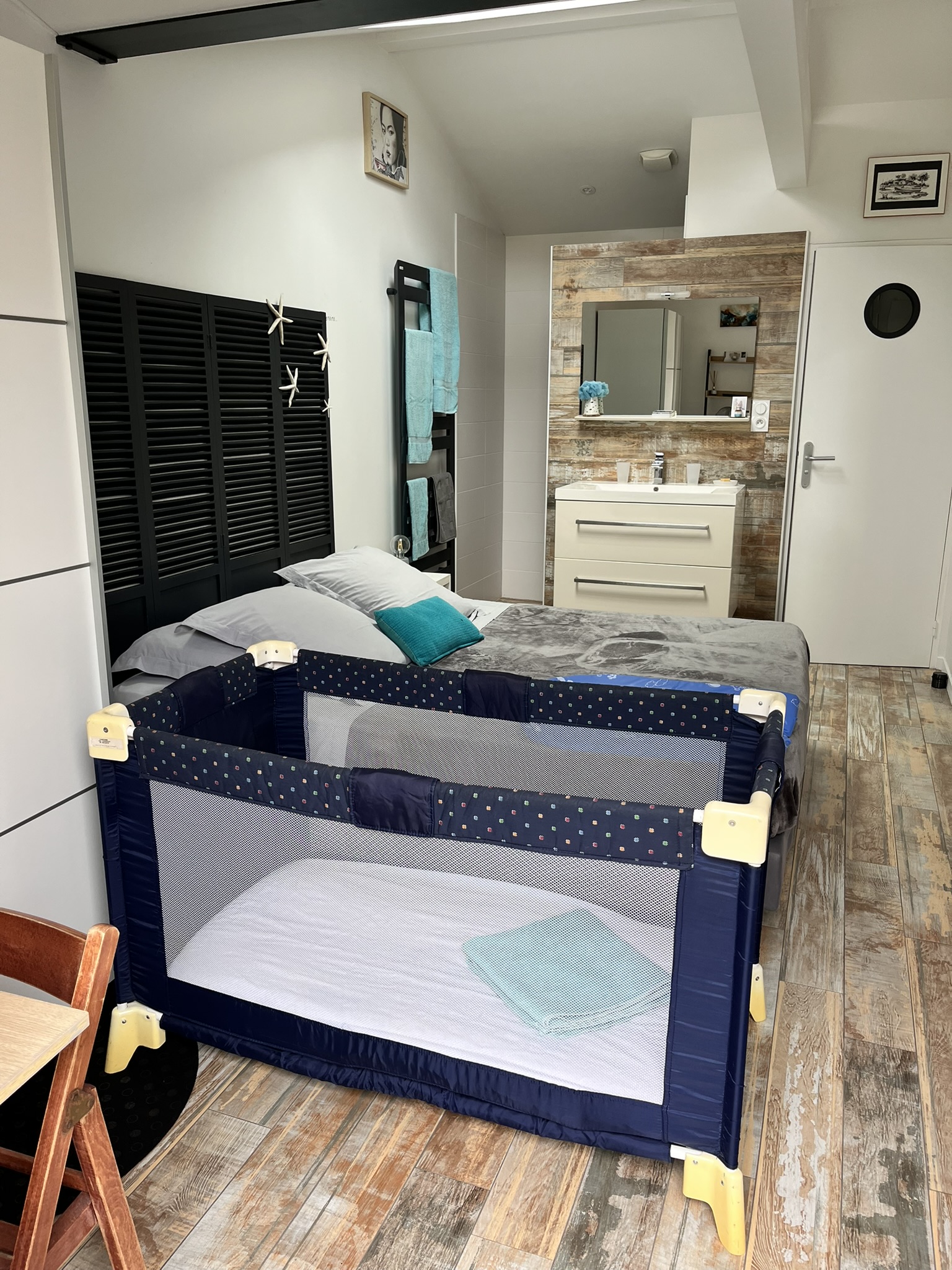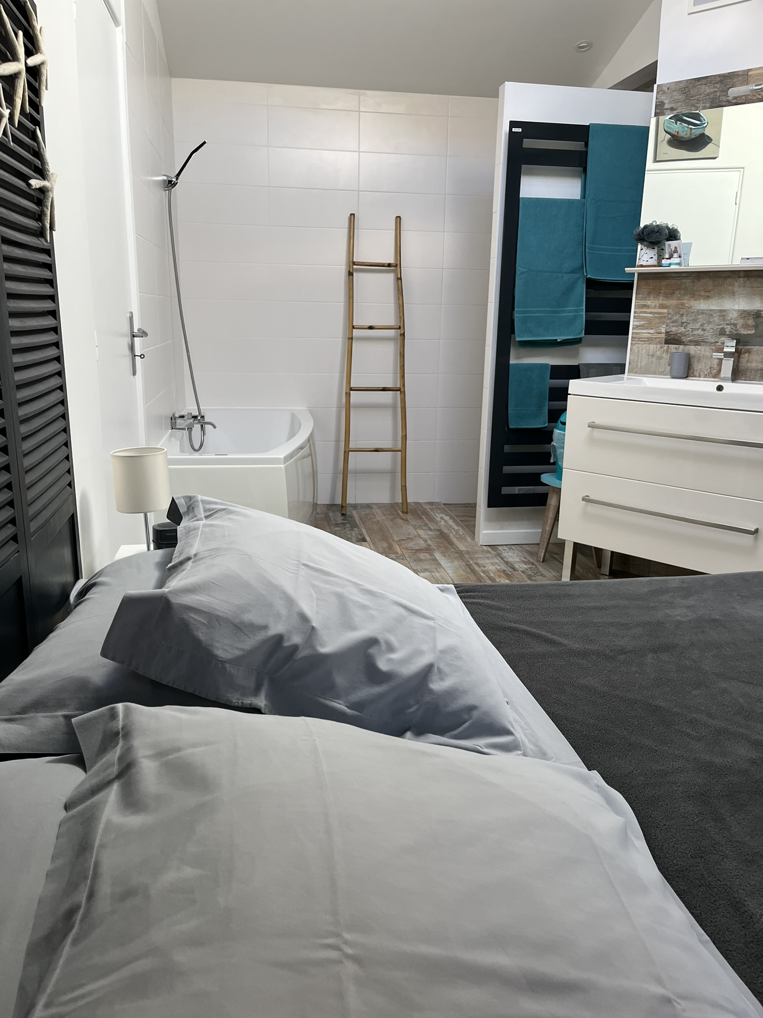 Chambre principale "Eyrac" : suite parentale avec salle bains avec douche et baignoire, idéale pour les bébés et jeunes enfants ; (sans TV car accessible directement au salon)