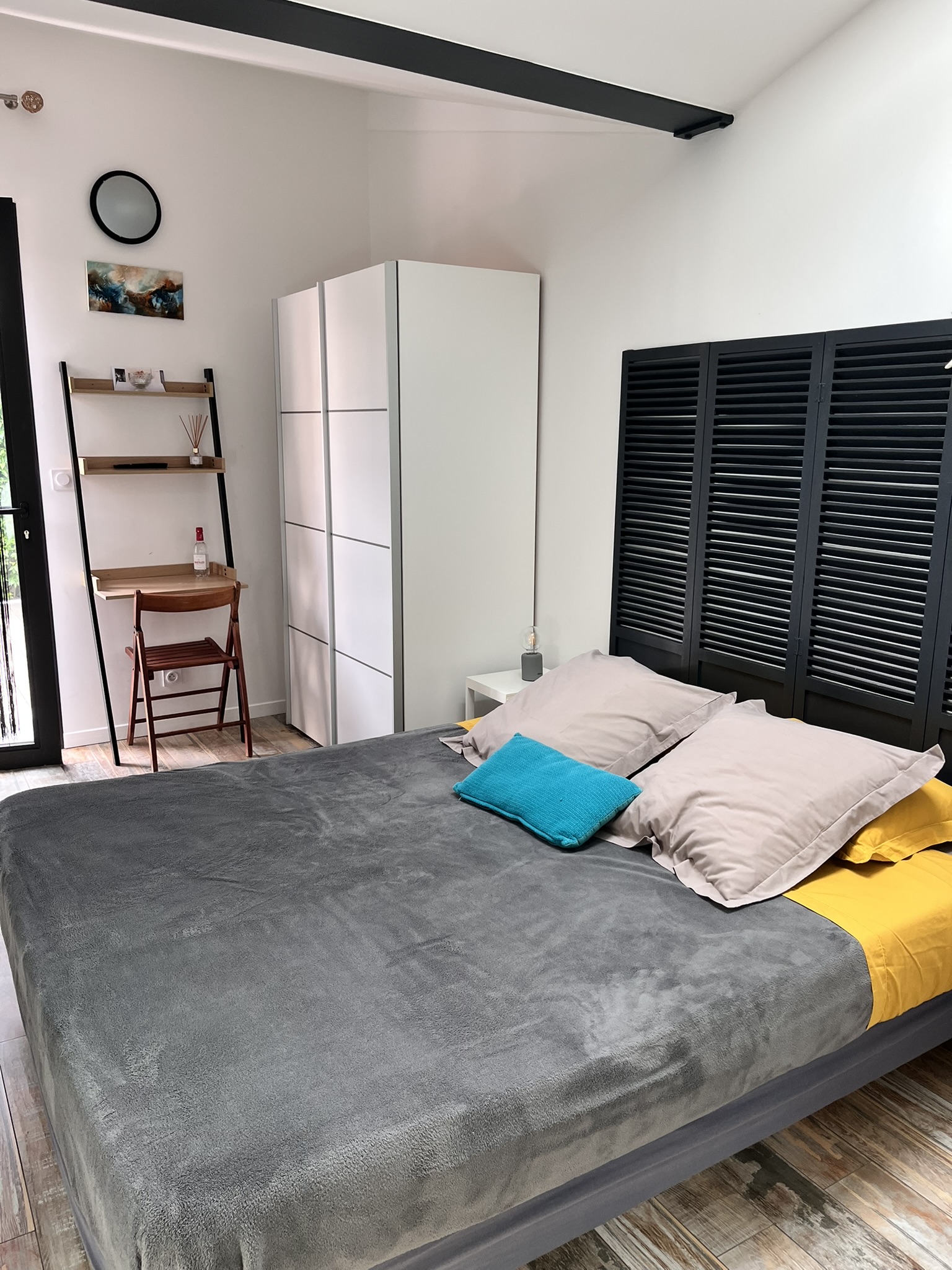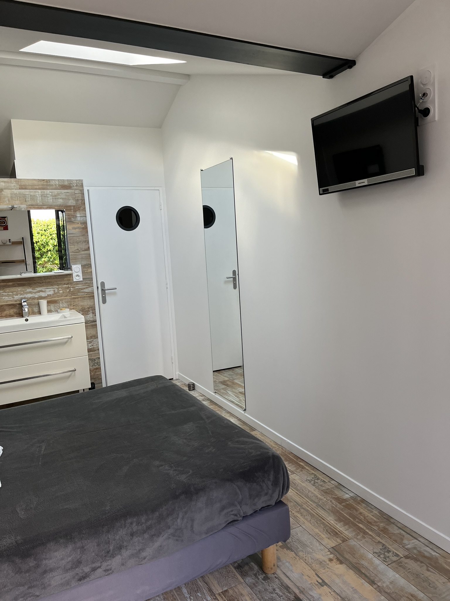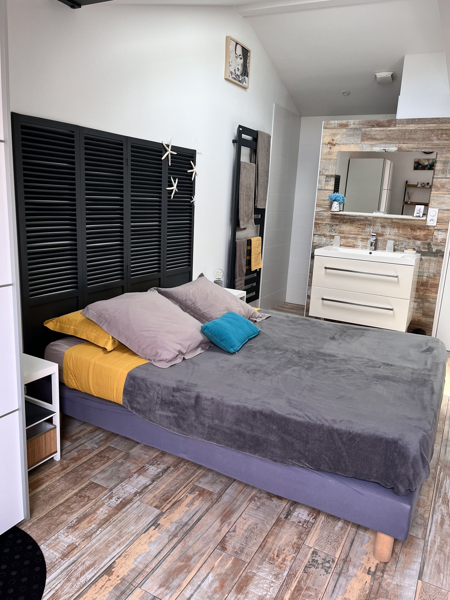 Chambre principale "Eyrac" : suite parentale avec salle bains avec douche et baignoire, idéale pour les bébés et jeunes enfants ; (sans TV car accessible directement au salon)