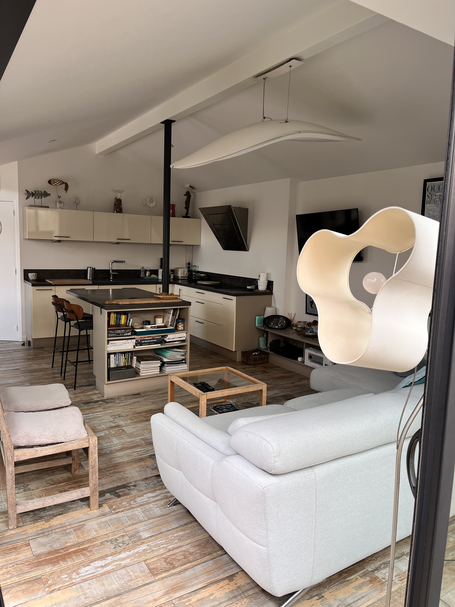 Très belle pièce de vie s'ouvrant entièrement sur l'extérieur, alliant cuisine-séjour-salon, très lumineuse et très bien équipée.
