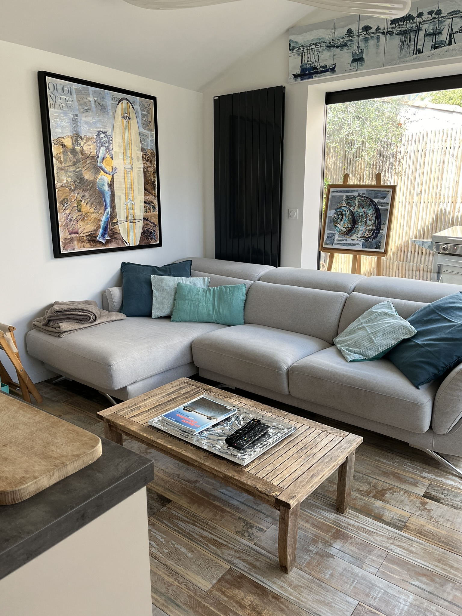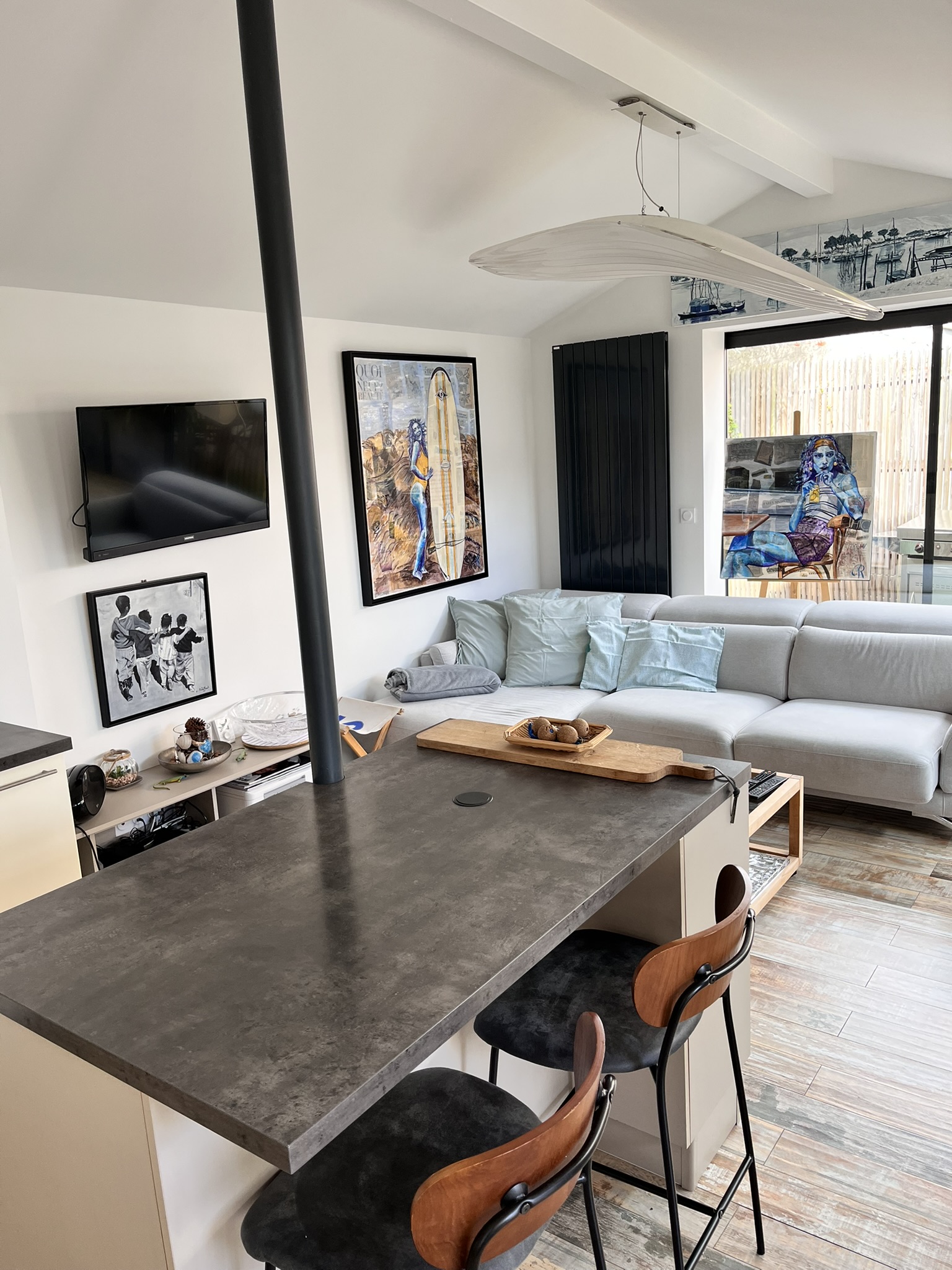 Le vaste séjour, baigné de lumière naturelle, s’ouvre sur le jardin et offre un espace convivial pour se retrouver à tout moment de la journée. La décoration douce et contemporaine crée une atmosphère apaisante, idéale pour des vacances reposantes sur le Bassin d’Arcachon.