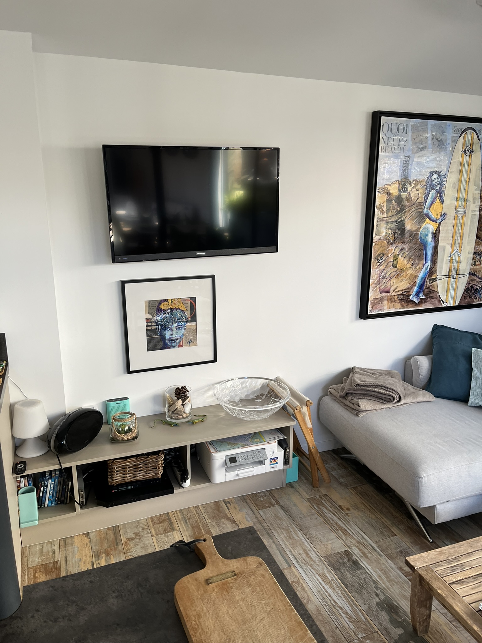 TV : écran plat mural amovible dans salon/cuisine : Chaînes TV d’Orange + lecteur DVD