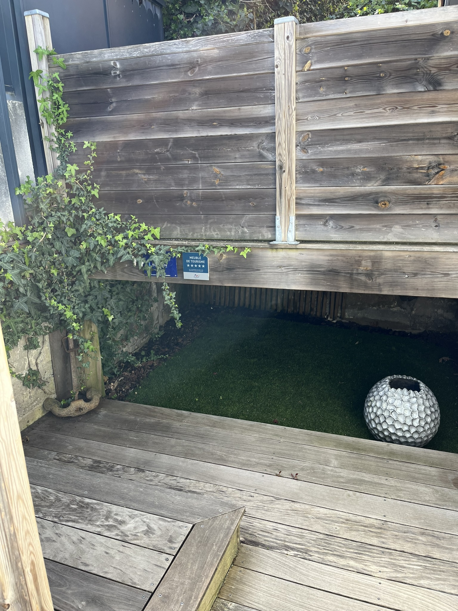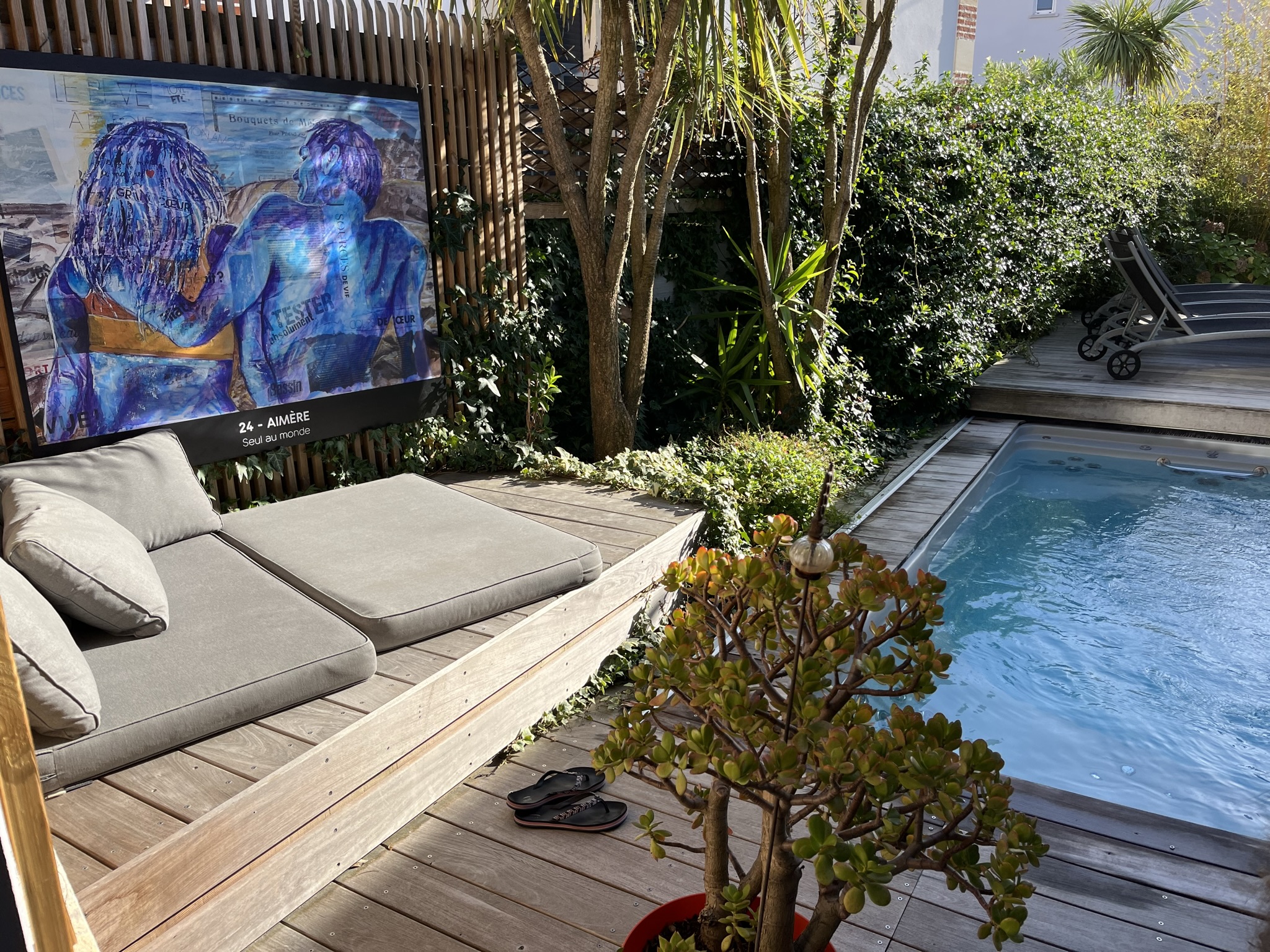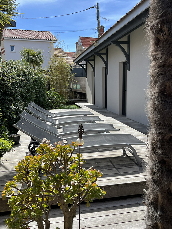 Le jardin arboré, entièrement clos, est idéal pour les familles. Les enfants peuvent y jouer en toute sécurité pendant que les adultes profitent d’un moment de détente autour de la mini‑piscine chauffée ou sur la terrasse.