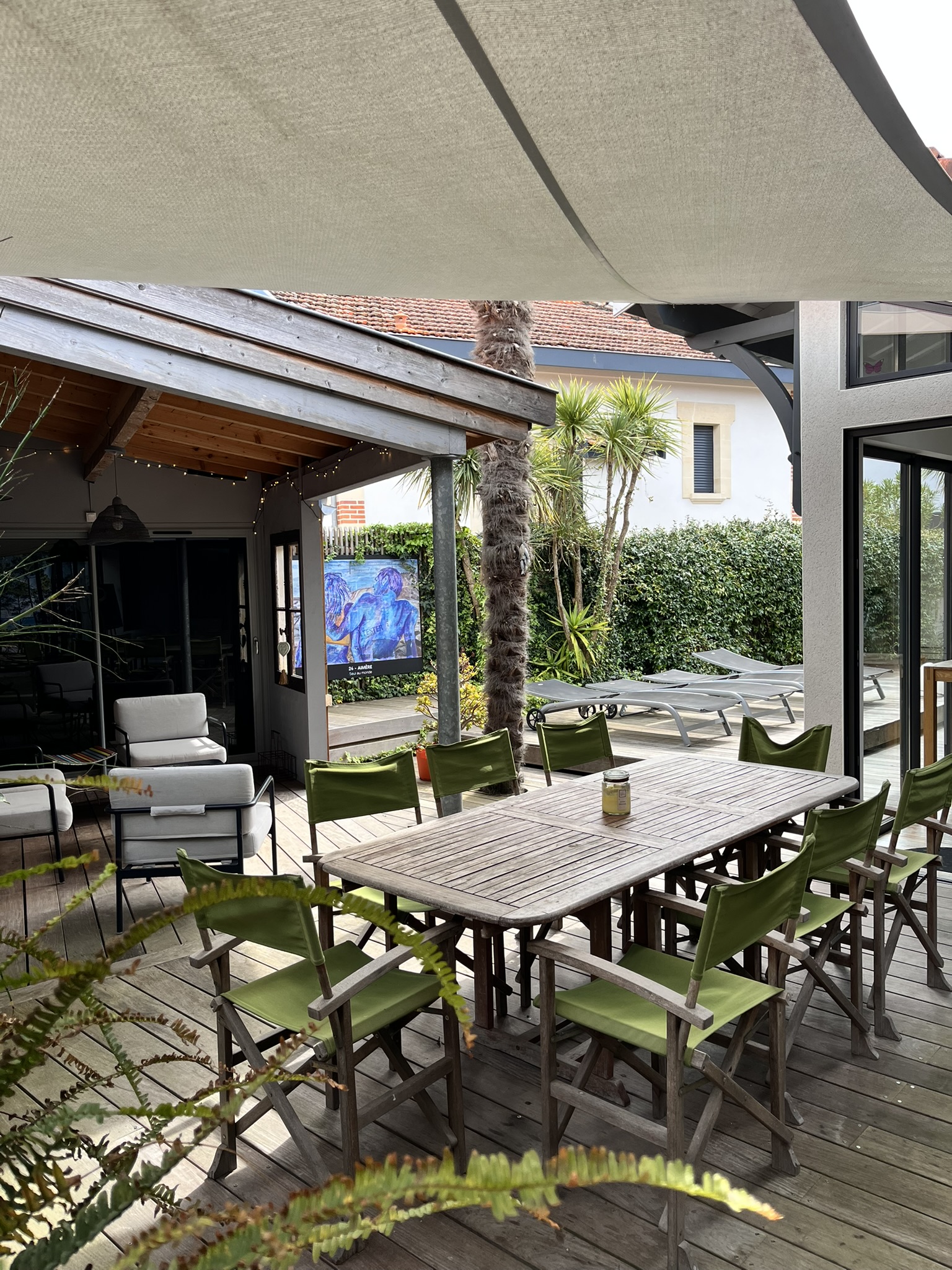 Equipements: Salon de jardin, 4 bains de soleil confortables, plancha, table à manger + 8 fauteuils pliables.